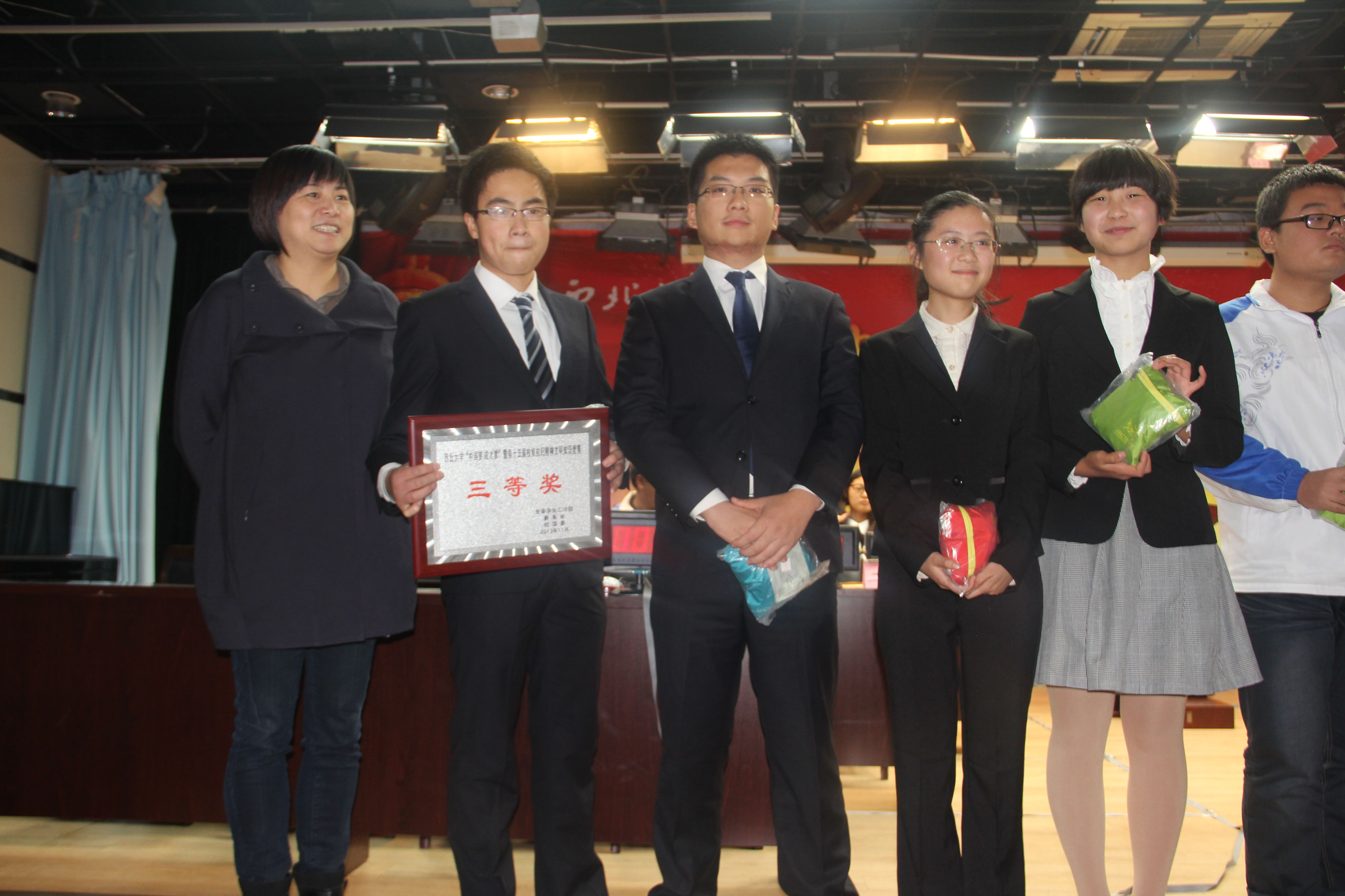 11月20日在长安校区所举办的初赛上,公司参赛队员沉着冷静,依靠扎实的基础和稳定的发挥,在必答题、判断题和风险题三个环节均表现可圈可点,最后一题冯茹同学在回答“十八大·中国梦”时,一气呵成,完美阐述其精髓,公司顺利以预赛成绩第一的身份杀入决赛,取得了历史性的突破,完成了太阳成集团tyc122ccvip多年的夙愿。但是公司并没有就此止步,在21日的决赛上,公司大部分同学冒着严寒奔赴长安校区为太阳成集团tyc122ccvip加油助威。决赛的难度较之于预赛有明显提升,增设了抢答题、发难题和看图题。公司代表队虽然在前期因为心理紧张等多方面因素错失良机,暂时落后,但是四位得力选手积极调整情绪,临危不惧,沉着应战,突破自我,依靠在最后两轮的精彩表现,在流畅的诠释了中国加入WTO的过程、意义以及中国近代以来的重大历史事件之后顺利完成逆转,取得了三等奖第一的好成绩。