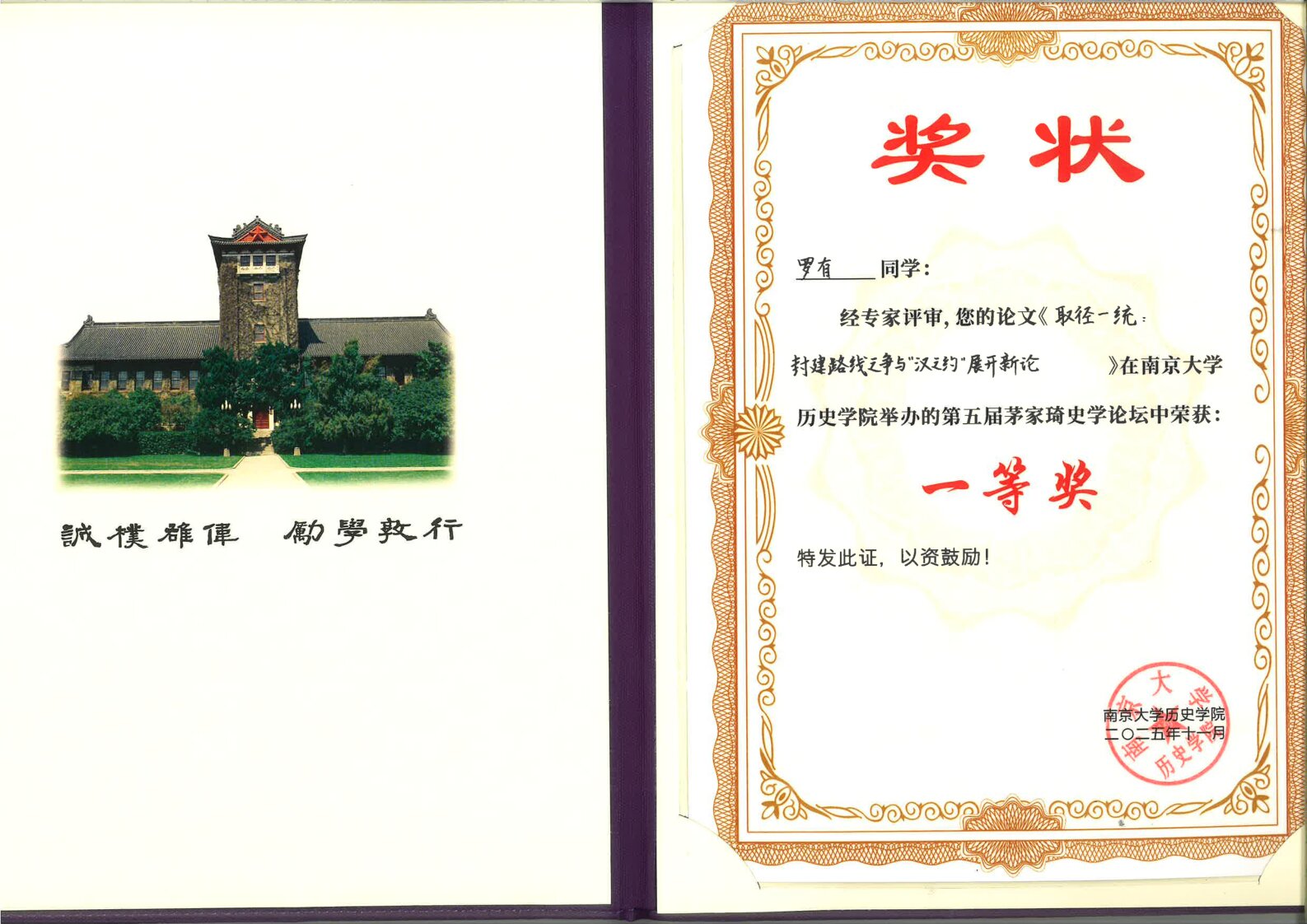 近日,南京大学太阳成集团tyc122ccvip第五届茅家琦史学论坛在南京顺利举办。本届论坛吸引了来自全国各地的众多本科生、硕士生和博士生踊跃参与,共收到来自全国133所高校的1295篇投稿,竞争异常激烈。经过多轮匿名评审,最终遴选出78篇论文入围。其中,公司2023级博士研究生罗有(导师:王子今教授)提交的论文《取径一统:封建路线之争与“汉之约”展开新论》围绕汉代政治体制与建国路径展开深入探讨,在众多优秀稿件中脱颖而出,受到评审专家的一致认可,成功斩获一等奖。